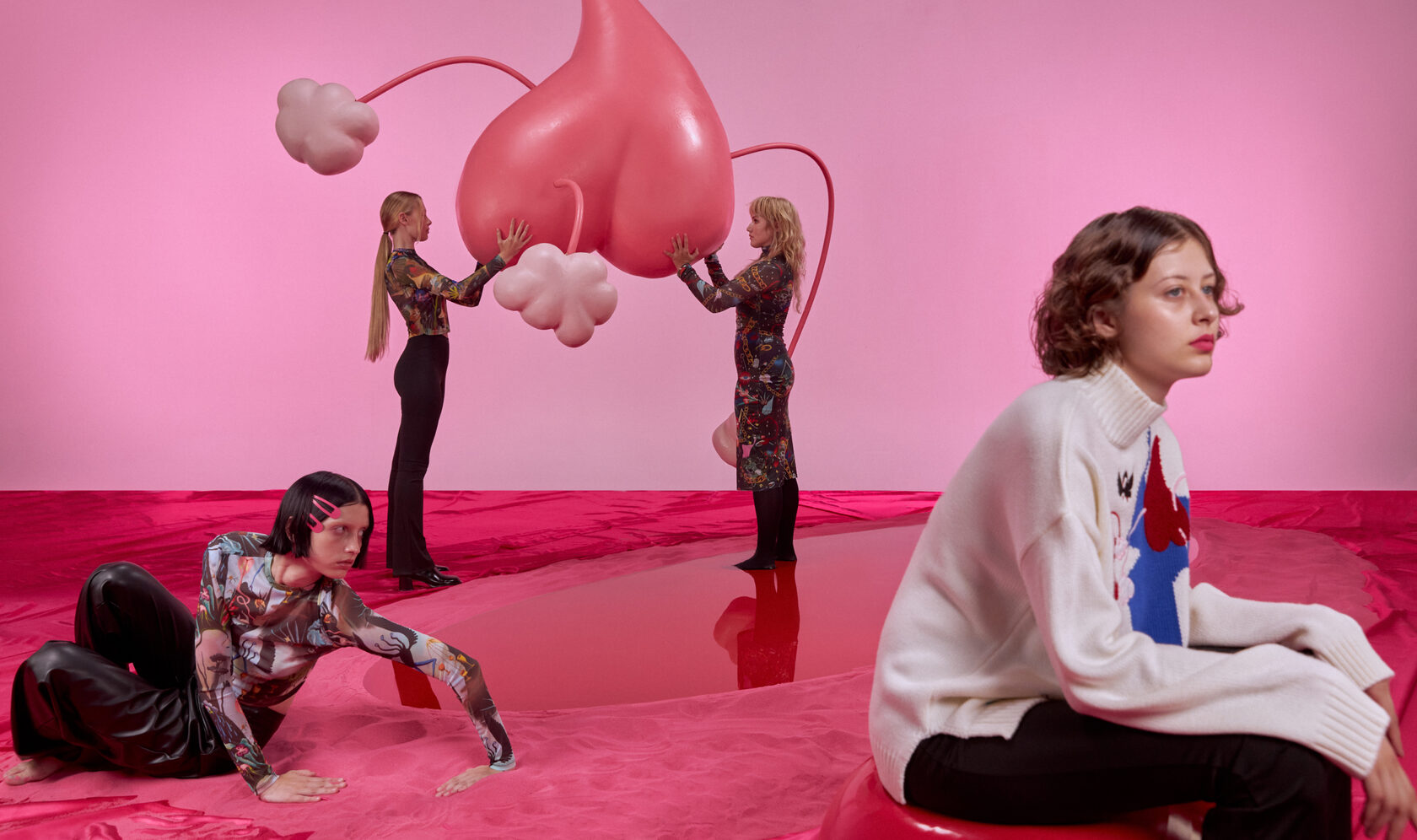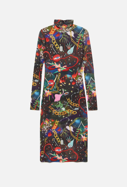 в ее абстракциях переплетаются фантазийные лесные жители, цветы, грибницы и магические кристаллы. Вместе мы пофантазировали на тему цветных снов, и теперь авторские принты и персонажи Андржиевской украшают вещи из капсулы.