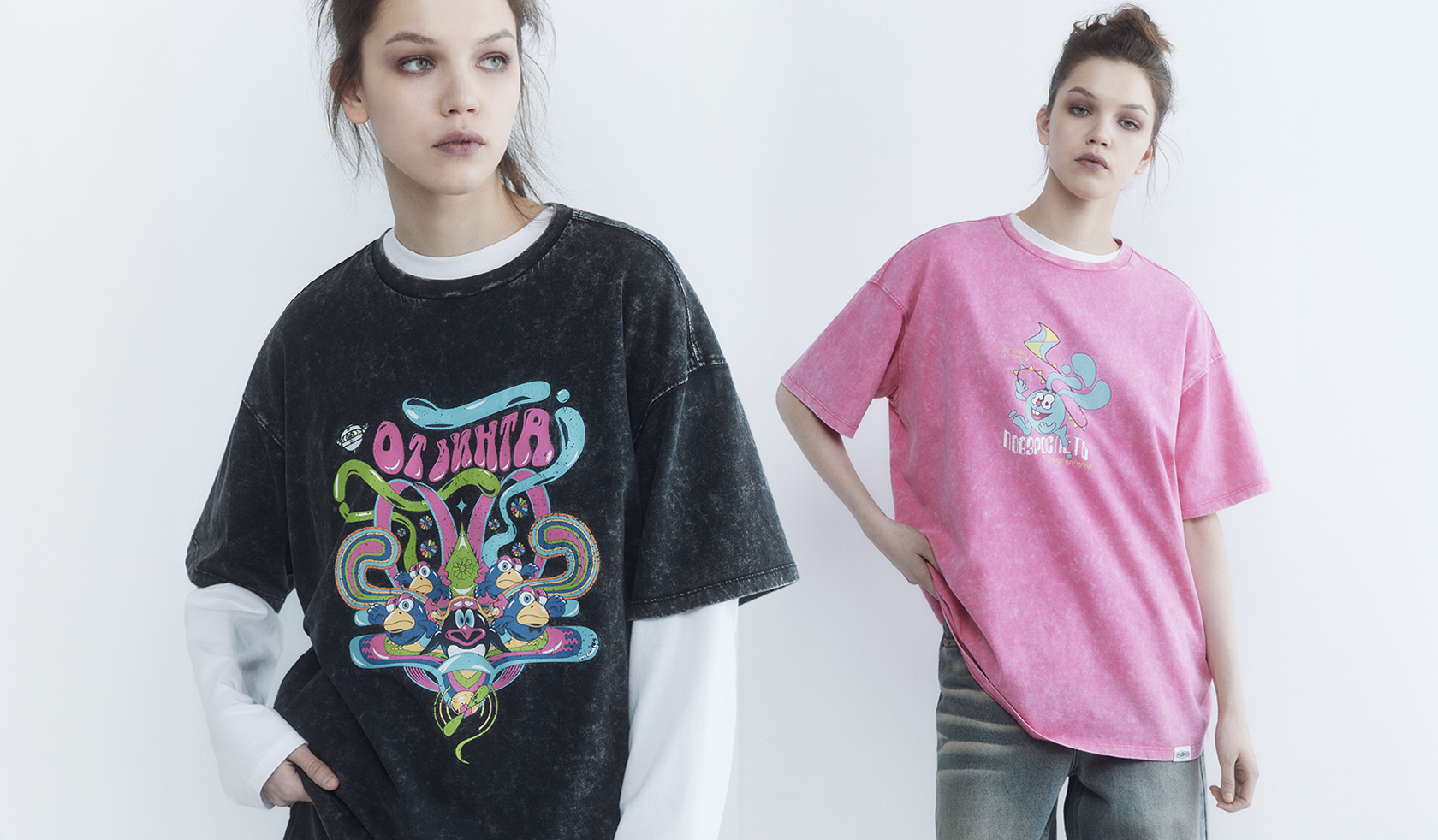 Мы добавили вещам в капсуле актуальных деталей: например, модный «вареный» эффект на футболках и лонгсливах и глитч-эффект на некоторых иллюстрациях.